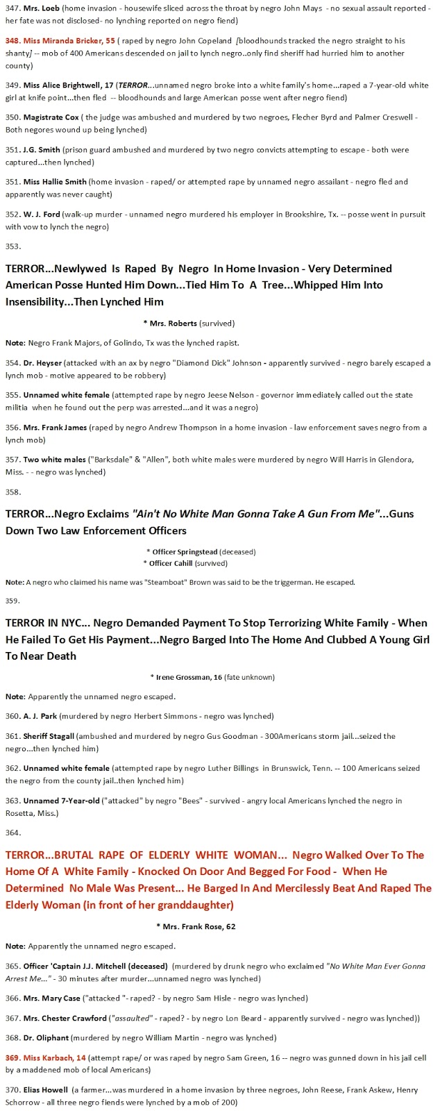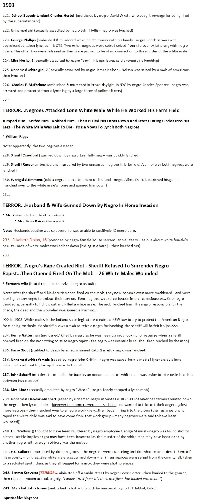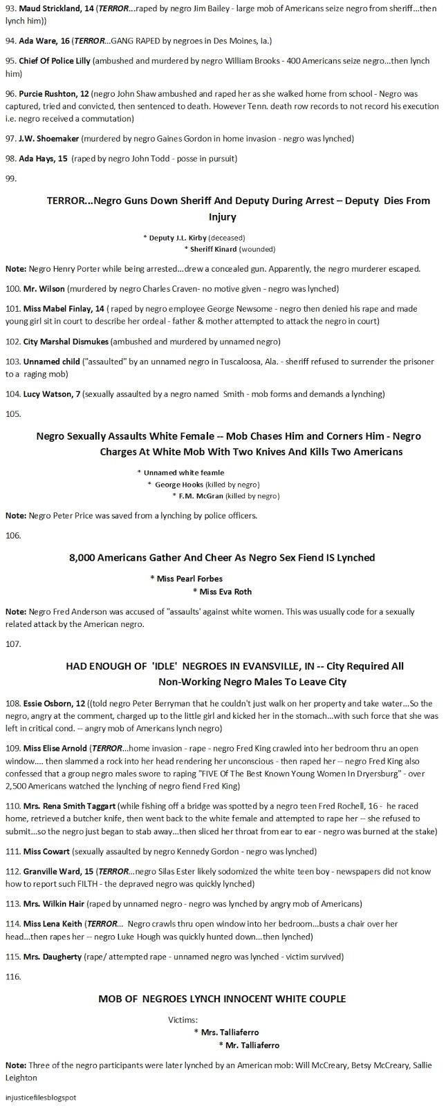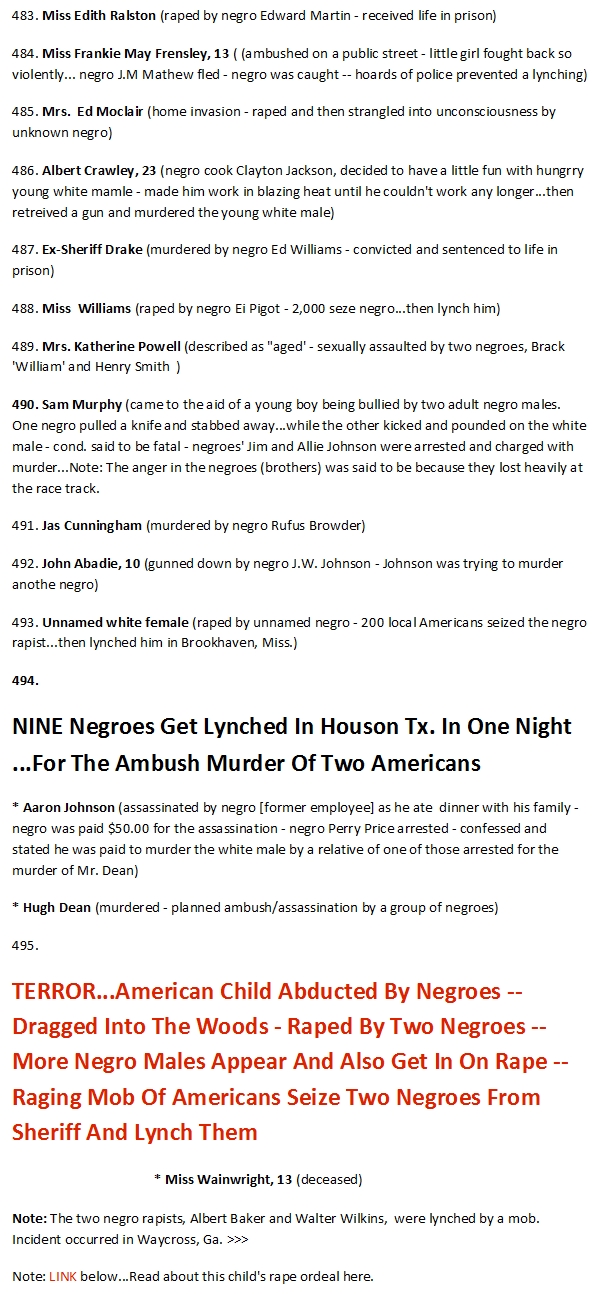 Clarendon County, S . Carolina: Two American girls, one 8-years-old and the other 11-years-old, were approached by a 14-year-old Negro boy, George Stinney, while they were picking flowers. When the Negro boy became insistent on sex with the 11-year-old...continue (LINK)