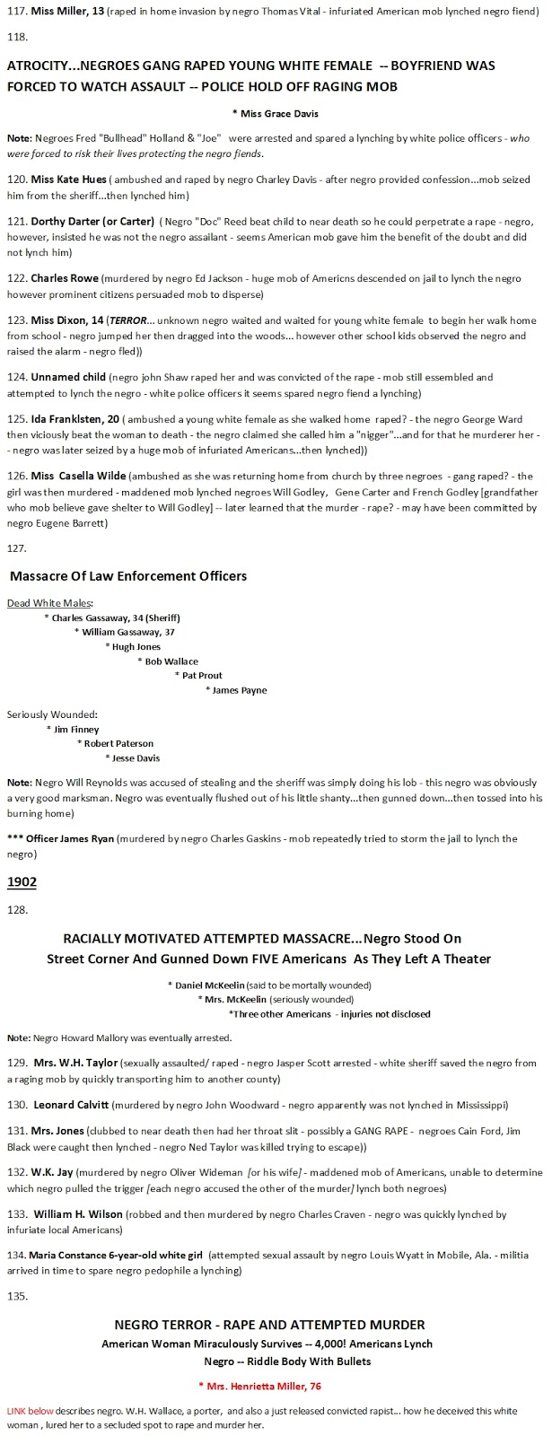 Ruston, LA: A Negro male, W.C. Williams, observed an American male and his female companion in an area secluded enough for the Negro predator to believe he could perpetrate a rape. The Negro though first had to deal with the white male. He did this by finding a club, sneaking up on the white male, then clubbing him repeatedly in the head ... until he was dead. Williams then turned his attention to the innocent American female. She was forced to endure Williams' rape but, incredibly, she was left very much alive by the Negro when he fled. She reported the incident to the sheriff and a posse of Americans, led by the sheriff, went after Williams. Williams was found hiding in the woods and was led back to town to stand trial. However, an American mob of 500 or more had now formed and was demanding immediate and salutary justice i.e. a lynching. Negro Williams was taken from the sheriff and led to a tree, where he was then stripped from the waist down and - apparently - castrated. When this act was finished, the Negro was lynched. While his body dangled it was then riddled with bullets.