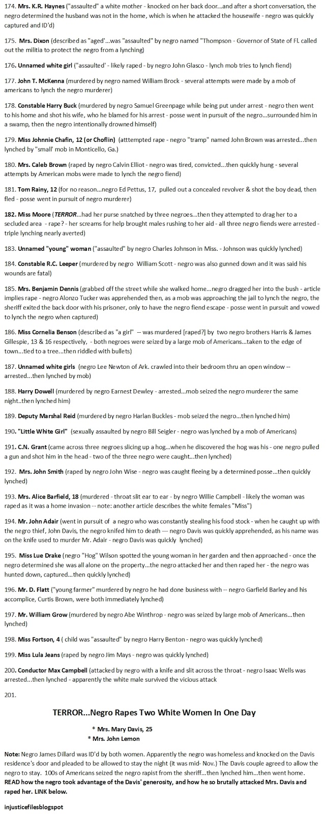 Martinsville, VA:: In 1949, Mrs. Ruby Stroud Floyd, 32, a Jehovah's Witnesses who did Good Samaritan work in the Negro section of Martinsville, VA, was victimized in one of the worst Negro atrocities ever committed against an innocent White female. She was very fortunate to have survived. On the day of the atrocity, Mrs. Stroud was in Martinsville's Negro community finishing up on her Good Samaritan work, however, though it was getting toward dark , and she was advised to leave, she decided to make last stop to collect a small amount of money owed her by a Negro lady. Because Mrs. Floyd wasn't quite sure of the address of the Negro lady , she approached four Negro men and asked if they could give her directions. A rape scheme was quickly hatched. The American woman was given phony directions in an attempt to lure her to a secluded area. After walking some distance Mrs. Floyd likely caught on to the scheme, since she tried to quickly double back. However, she was immediately surrounded by the four scheming Negroes ... and they wasted no time, first grabbing and throwing the helpless and frightened woman to the ground, then, ripping off her clothes. Off in the distance another adult Negro male observed what was going on and, incredibly(!), instead of helping the poor woman, he quickly rounded up two more Negro males to get in on the rape. All seven then took turns raping the White female, and also beating on her.