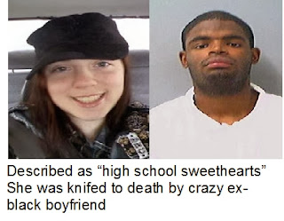 Note: Some internet sites claim they were "former" boyfriend/ girlfriend, while others imply they were still a couple. Based on my vast knowledge of these black male/ white female relationships, she wanted to end it, or thought she did end it...and the black male said, "No fuckin' way white bitch. You don't tell me NOTHIN'! I TELLS YOU." Since the black male brought no weapon, it tells us that the murder by strangulation was a spontaneous outburst. So far, the black male has refused to tell anyone why her murdered the white female.
